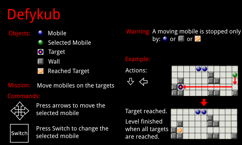 Defikub is a puzzle game similar to Ricochet Robots. The aim is to put mobiles on targets, but once a mobile is moved in a direction, it can only be stopped by another moibile or a wall.